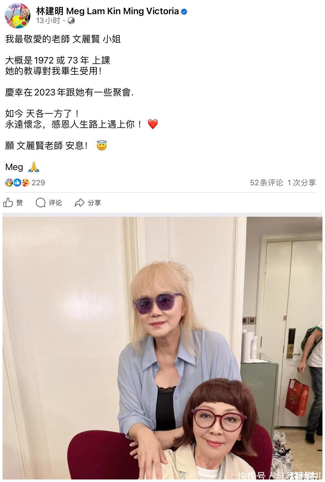 资深艺东谈主林建明得知了文丽贤离世的音书后也发文,发照吊祭。文丽贤之于林建明也算是有恩光渥泽的东谈主,1971年林健明考中无线艺训班失败而归,自后转投了邵氏覆按班,毕业之后莫得取得签长约,自后在文丽贤的安排下,林建明与文丽贤学作念模特,之后闯出表情。得知恩师离世,林建明万分不舍,她称八成在1972年或是1973年随对方上课,对方的带领令她终生受用,而她临了一次见到文丽贤亦然2023年的约会上。
