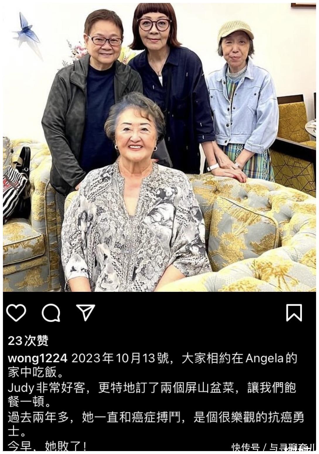 汪曼玲临了一次见到文丽贤是在2023年10月13日,其时由文丽贤作念东,订了两个屏山盆菜呼唤宇宙,让宇宙尽兴而归。从汪曼玲晒出确其时合照来看,文丽贤看起来就仍是很羸弱,不外状态并不算太差,她应该戴了假发,还戴了一副大镜框的眼镜,上高下下从简而多礼,保握着个东谈主风采。其时同场的还有林建明,文丽贤的妹妹等名东谈主。汪曼玲暗示昔时几年,文丽贤一直在与病魔战役,是个很乐不雅的抗癌骁雄,可惜临了照旧败了,令东谈主恻然。